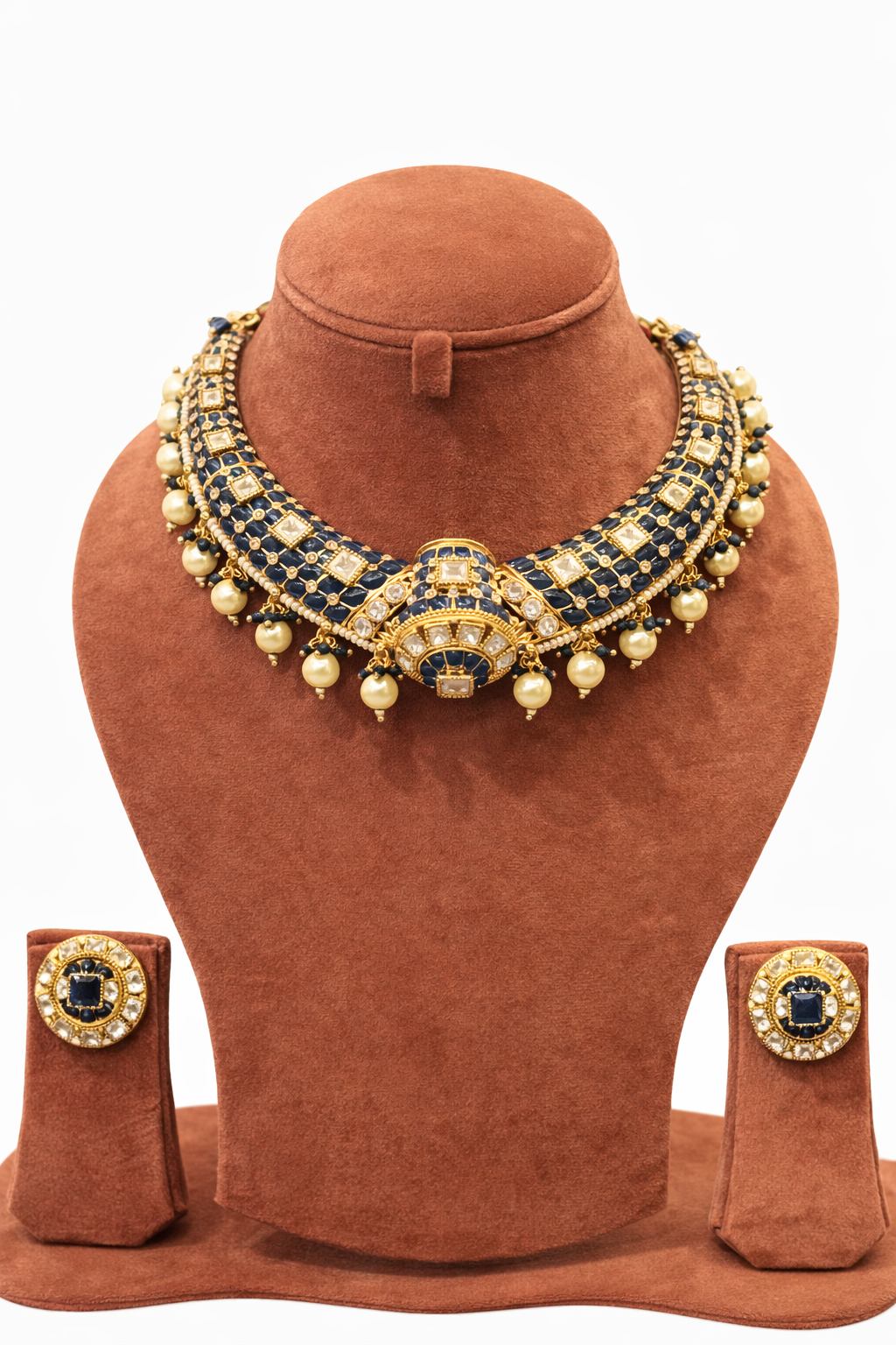 The Blue Polki Hasli set features intricately crafted Polki stones, renowned for their authentic aesthetic. Designed for elegance, this set enhances formal attire and can complement various skin tones. Its unique coloring and craftsmanship offer a sophisticated option for special occasions, appealing to discerning tastes in fine jewelry.