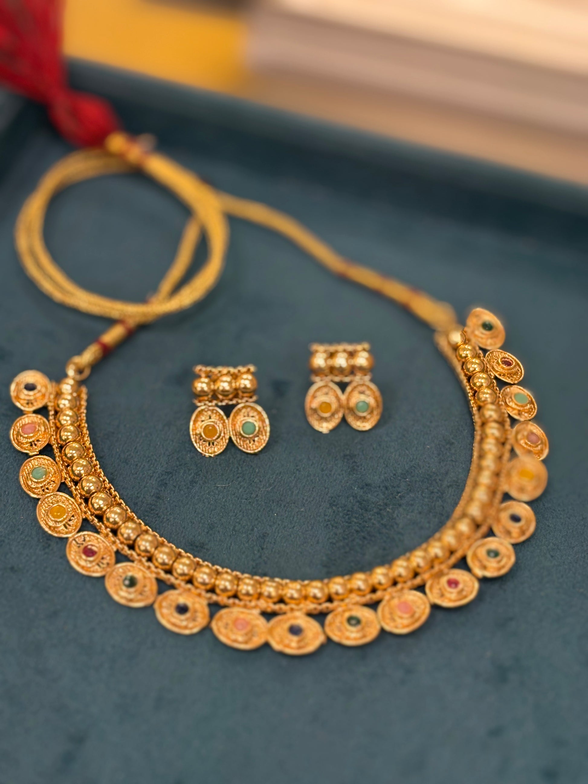 Be the epitome of elegance with our Navrattan Choker Set. Adorned with stunning navrattan stones, this temple-inspired set is perfect for weddings and special occasions. Its timeless design and comfort make it ideal for destination weddings. Trust kiwibymusskan to make your celebrations both safe and comfortable.