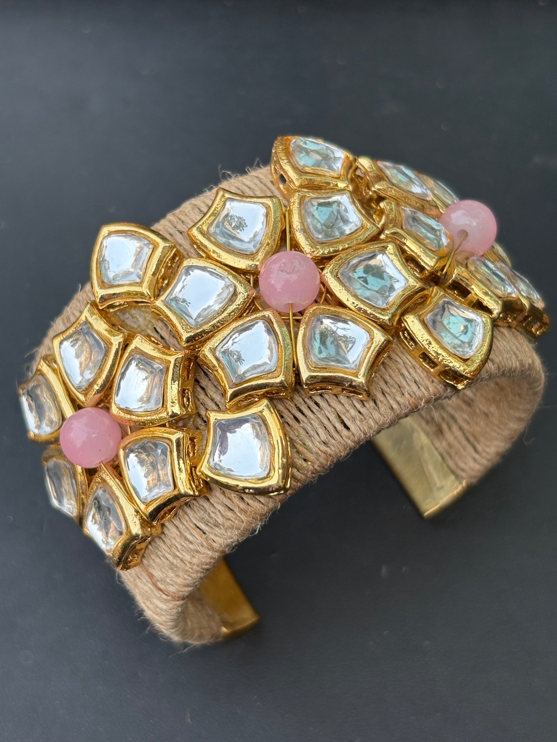 Elevate your style with our Polki Pink Jute Cuff. Made from kiwi jute, this handcuff will add a touch of natural elegance to any outfit. Expertly crafted, it's a must-have accessory for those who appreciate sustainable fashion. Stand out from the crowd with this unique and eco-friendly statement piece.