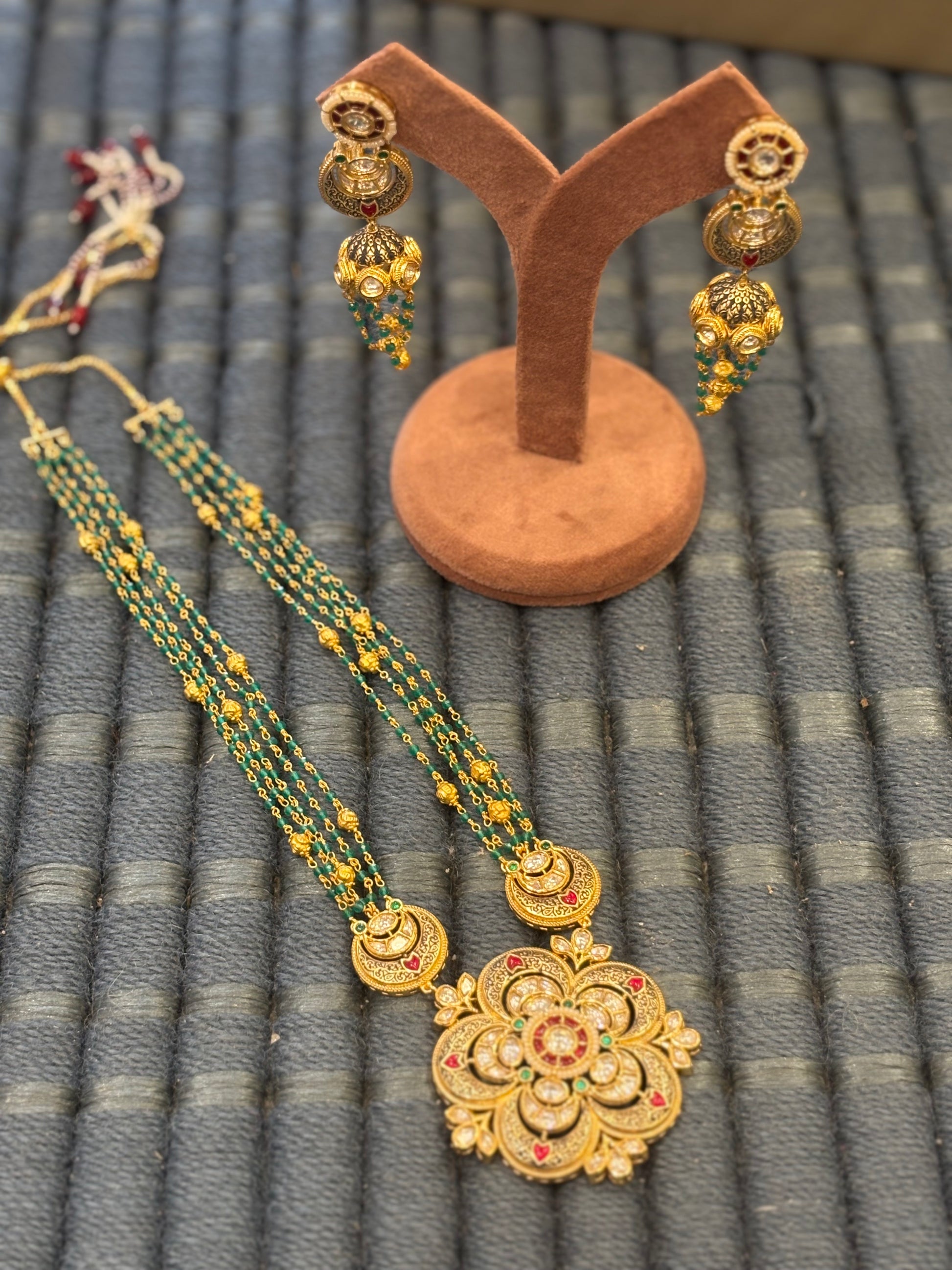 The Temple Pendant Set from Kiwibymusskan features a traditional design complemented by green handmade stringing. This combination enhances aesthetic appeal while reflecting cultural artistry. The meticulous craftsmanship ensures durability, making it suitable for both everyday wear and special occasions.